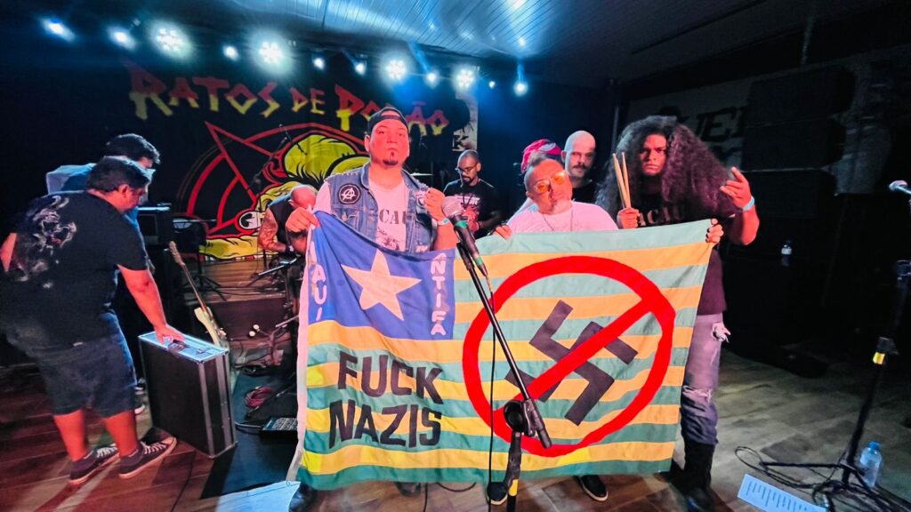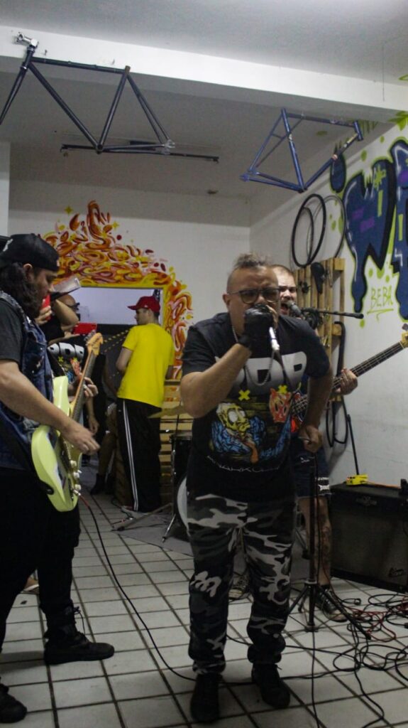 GUSTAVO: A forma como as coisas acontecem aqui é o que sufoca as bandas. Várias bandas que tinham massa aqui já sumiram por isso, né? Por essa falta de espaço. Acredito que todo mundo tava tentando também uma vez pra tocar em algum evento desse que precisa de edital ou pra lançar algum projeto legal pra tirar grana pra gravar alguma coisa e tal. O que seria do punk se não fosse essas mídias alternativas que a gente sempre, tipo, chegou até aqui assim, né? A gente tem que aproveitar, tipo, rede social, fazer uso também dessas plataformas aí do governo, tá? Tipo, pra conseguir entrar em algum edital e tudo mais, mas aí também não pode esquecer de fazer o corre por conta própria. Divulgar os eventos por conta própria, juntar a grana do bolso mesmo do trampo e pagar o som pra poder fazer o evento. Enfim, a gente corre assim, né mano? O melhor seria a gente estar recebendo também. A gente não é contra estar lá e receber, na verdade. A gente é contra a humilhação que tem que fazer pra poder chegar lá, entendeu? É mais isso.